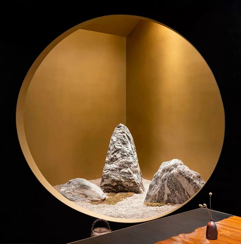 林立的建筑群中信步穿行,推门而入,是静谧沉稳的一楼空间。门口大片黑色竹纹板与黄铜材质的几何前台形成自然隔断,围绕金色前台是黑色皮革墙体,粗粝的块石台过渡线条与金属光泽,对冲了细节与材料的精致感。拙朴嵌之现代,线面辅之几何。品茶区,大面积的黑色点缀镂空圆金,枯山水装饰置于其中,空间层次更为跃目。一饮涤寐,再饮清神。品茗深谈,不亦乐乎。