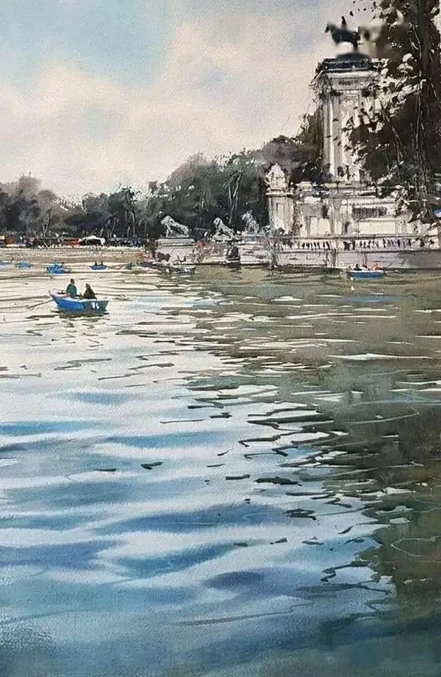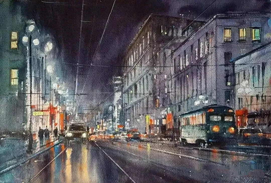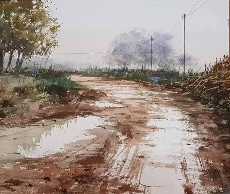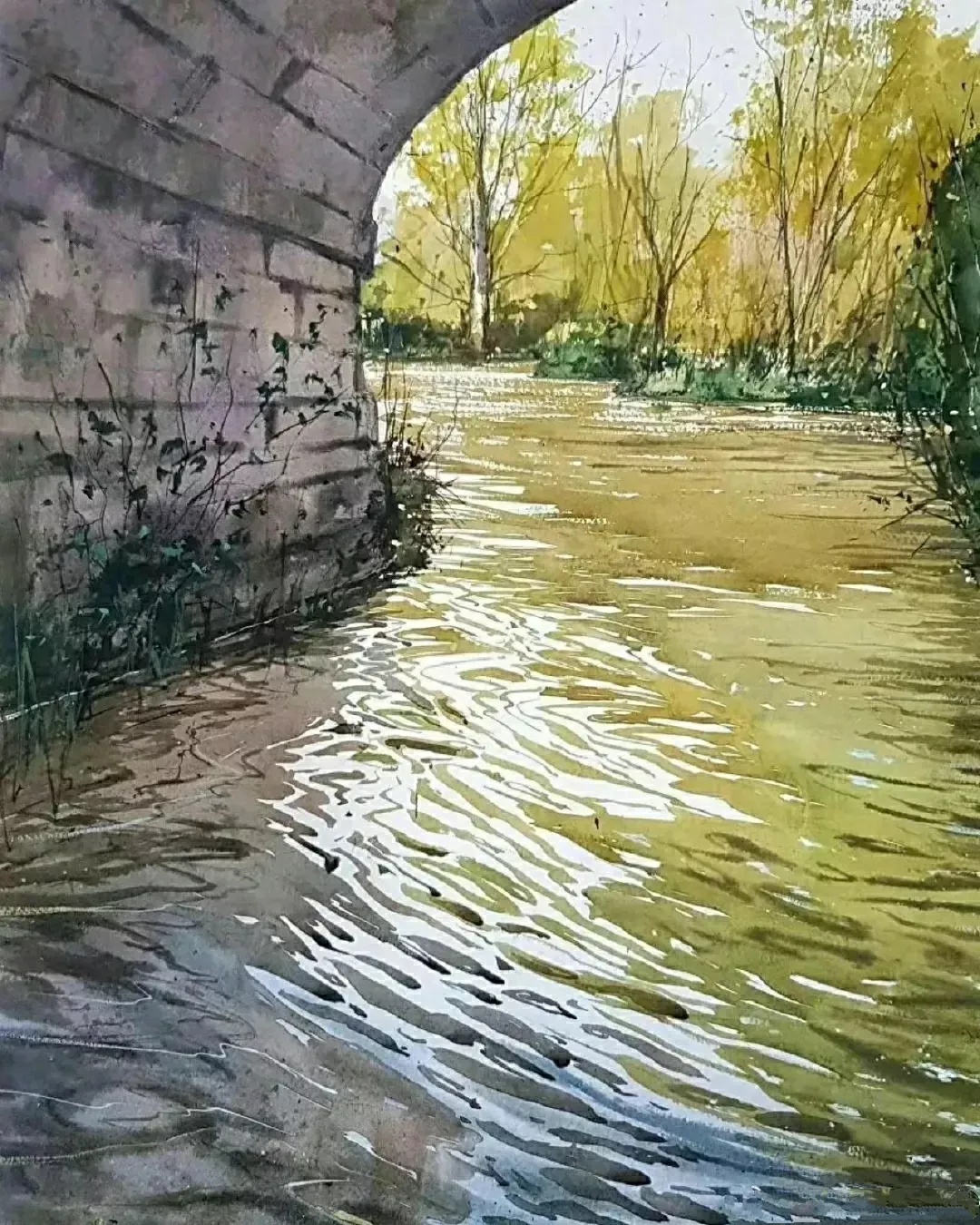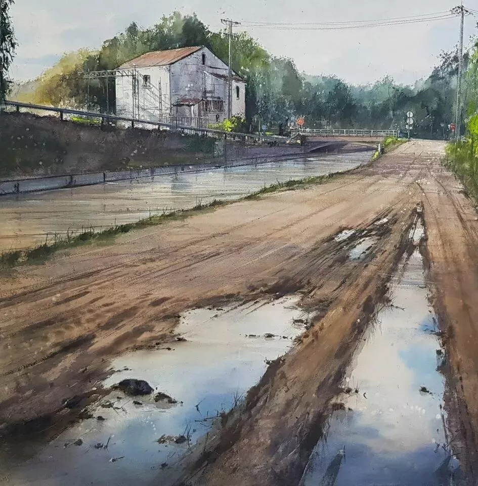 轻盈层叠,水彩颜料因水的流动性形成通透渐变的效果,像是晨雾中绽放的花蕾,每一笔都带着呼吸般的生命力。例如描绘天空时,靛蓝与湖蓝交融的边缘仿佛云絮被风吹散的痕迹。