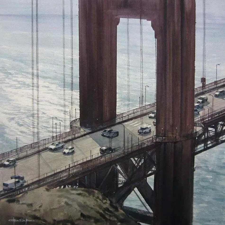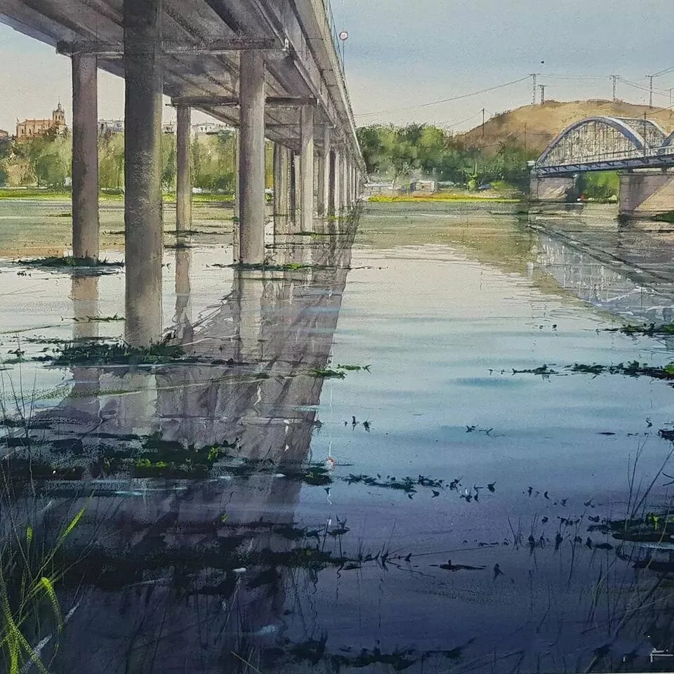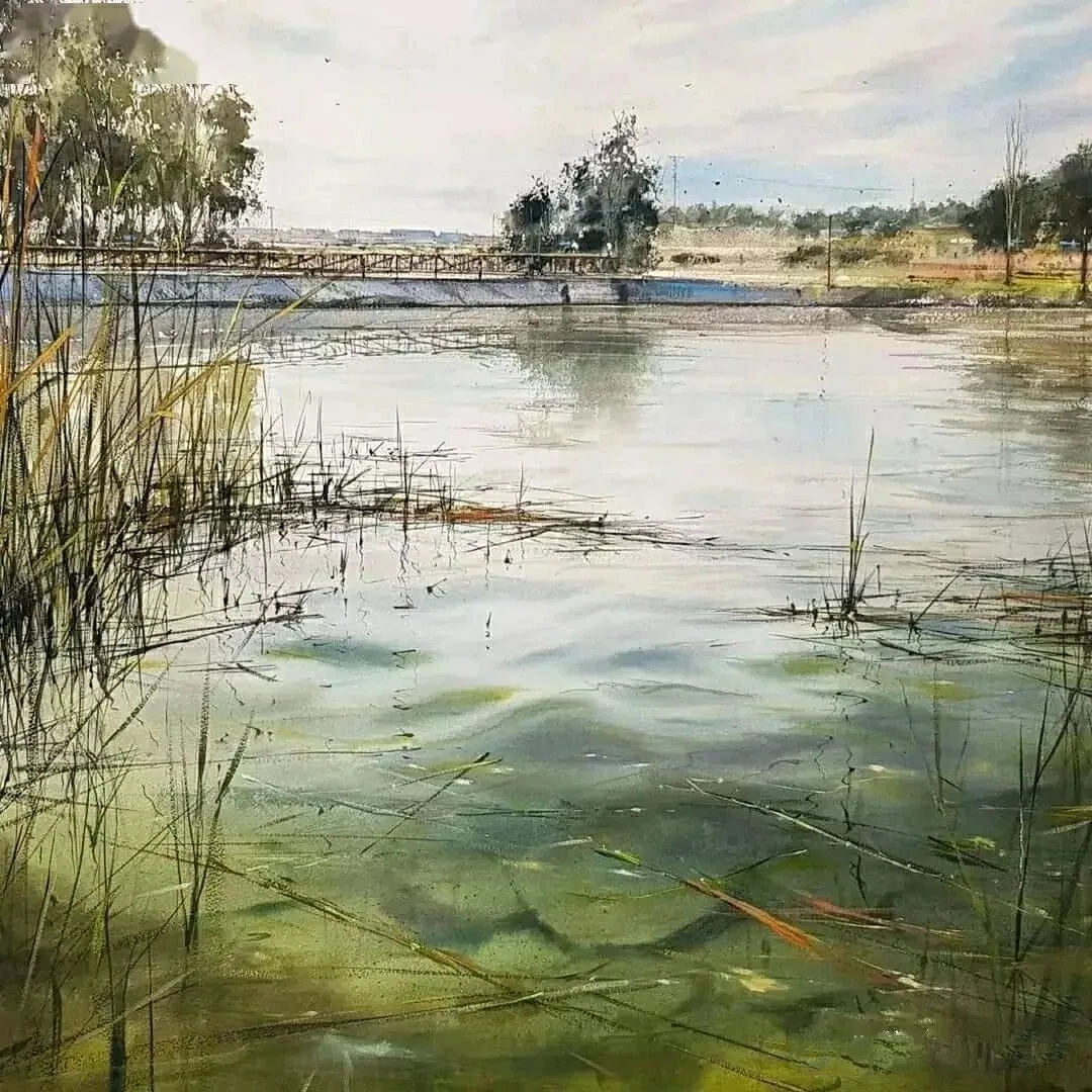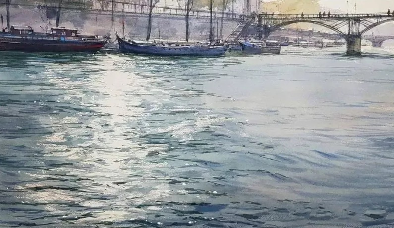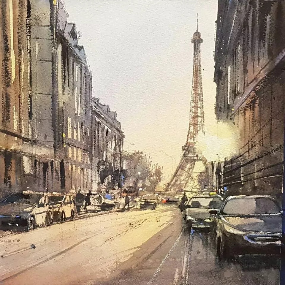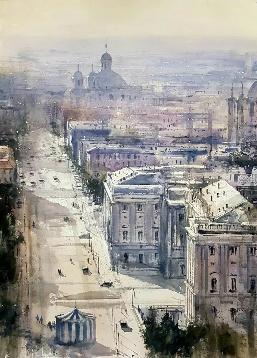 轻盈层叠,水彩颜料因水的流动性形成通透渐变的效果,像是晨雾中绽放的花蕾,每一笔都带着呼吸般的生命力。例如描绘天空时,靛蓝与湖蓝交融的边缘仿佛云絮被风吹散的痕迹。