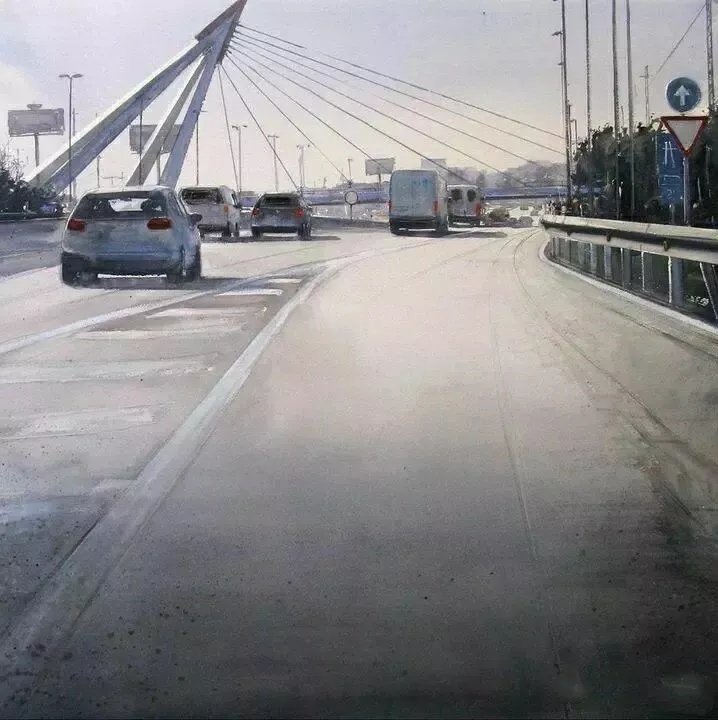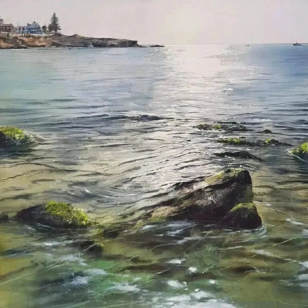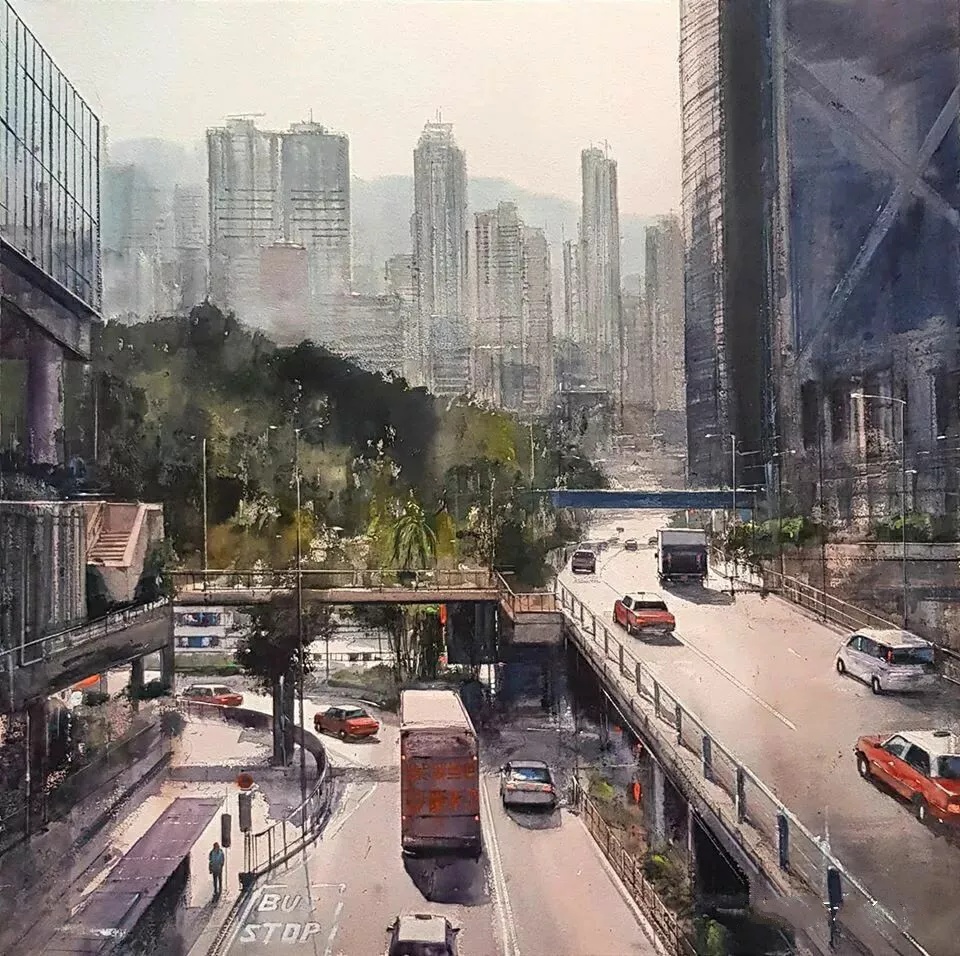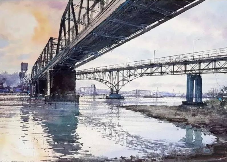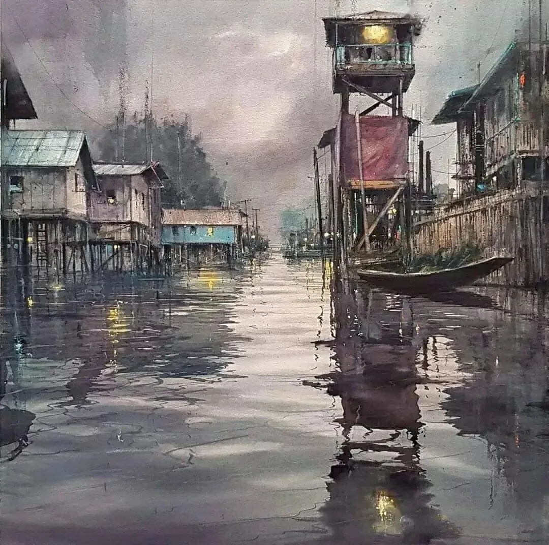 轻盈层叠,水彩颜料因水的流动性形成通透渐变的效果,像是晨雾中绽放的花蕾,每一笔都带着呼吸般的生命力。例如描绘天空时,靛蓝与湖蓝交融的边缘仿佛云絮被风吹散的痕迹。