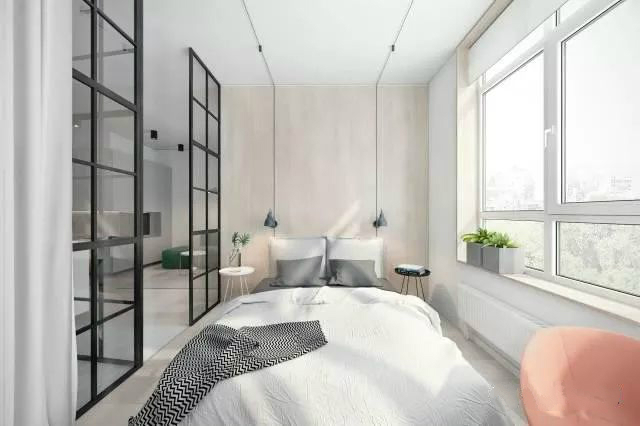 厨房与起居室相结合; 隔离了一间卧室和一间浴室。 然而,由于卧室最靠近窗户的地方,它被玻璃隔断墙和遮光窗遮蔽。 很多自然光通过大窗户进入白天。
